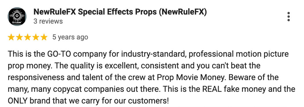“Prop Movie Money Inc. has the most realistic prop money for all your film or video needs at an unbeatable price for the quality! They have every kind of money you could want and everyone I talked to was extremely helpful and professional! I received my order within 3 business days, which was awesome because I was filming on a tight schedule. I would definitely recommend Prop Movie Money Inc. to any industry professional!”