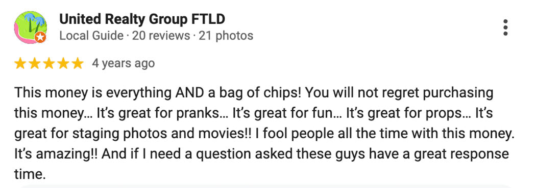 "Their money is so realistic and is perfect for any project from films, to music videos, to pranks! Even if you don’t have an idea for a project yet, just order some prop movie money. When it comes in and you’re holding it in your hand the ideas will come rushing! The possibilities are endless!"